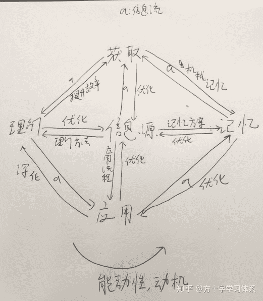 当我们有了一个较为合理的信息源体系之后,我们通过信息渠道来获取信息。被我们获取的信息有两个去处:1.输入海马体,直接被机械记忆。2.输入大脑,被我们尝试理解。一般来说,一个合理的学习过程,是以“获取,理解,应用,记忆”四步走为主,以机械记忆为补充的过程。