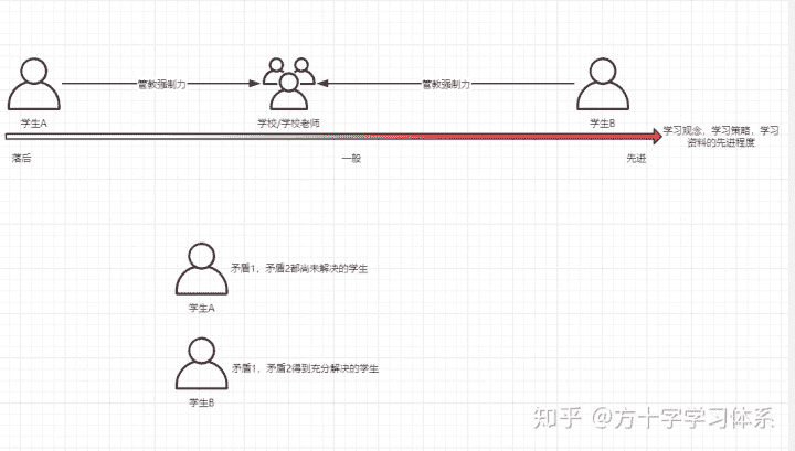 接着,在诸如方十字这样的策略组织机构的推动下,学生们的竞争方式,由低层次体系内部竞争,转变为了体系与体系的竞争。矛盾充分解决的高层次体系学习者,将会吊打矛盾部分解决的中层次学习者,而矛盾部分解决的中层次学习者,将会吊打纯管教主义的低层次学习者。好比现代的步枪,近代的火绳枪,古代的弓弩之间的关系。