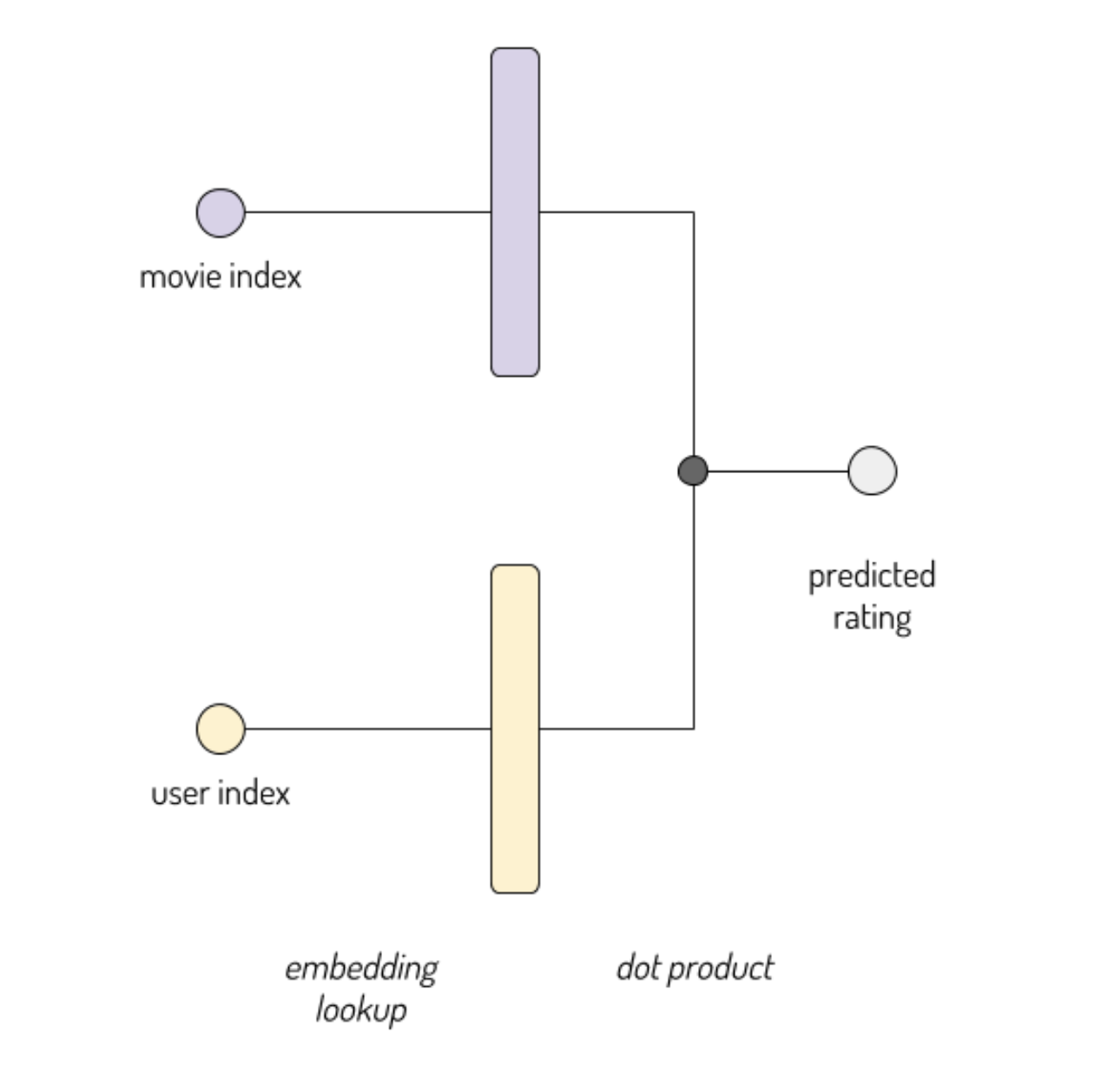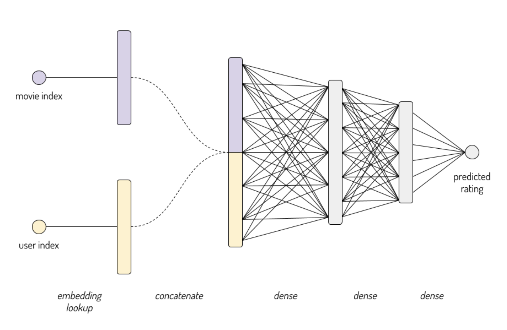 注:一个关键的实现细节是嵌入层接受被嵌入实体的索引作为输入(即我们可以将userIdmovieId作为输入)。 你可以将其视为一种“查找表”。 这比采用独热向量并进行巨大的矩阵乘法要有效得多!