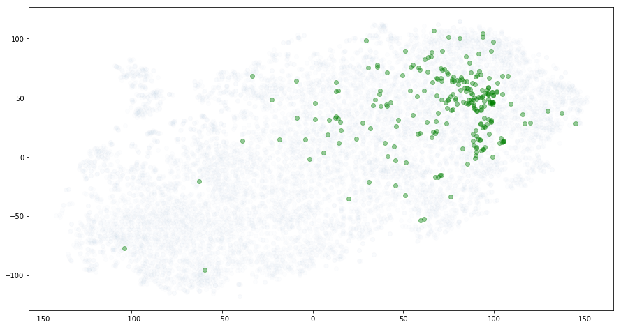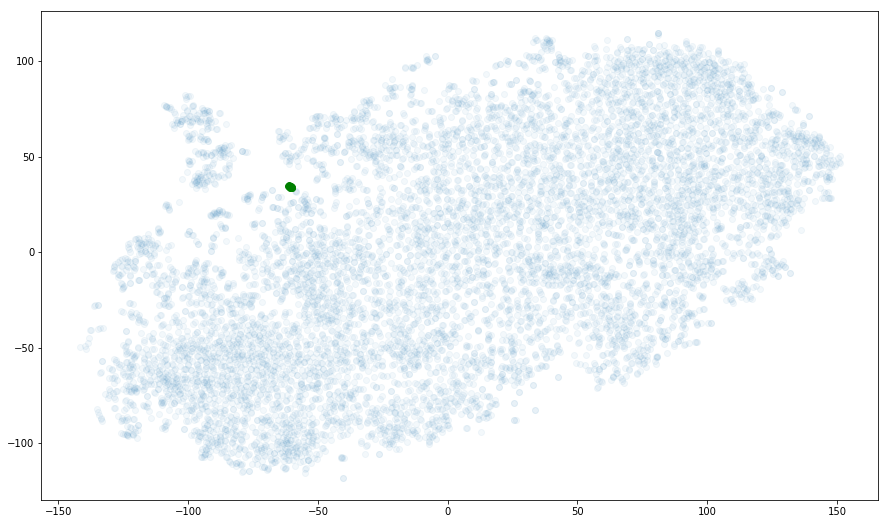 我提到 t-SNE 在特征空间中试图保持实体之间的“接近度”。 我们在之前的课程中看到,有许多竞争性的距离概念。 默认情况下,t-SNE 使用欧氏距离。 但是因为已知余弦距离适用于嵌入,我们将在创建模型时传递metric ="cosine"