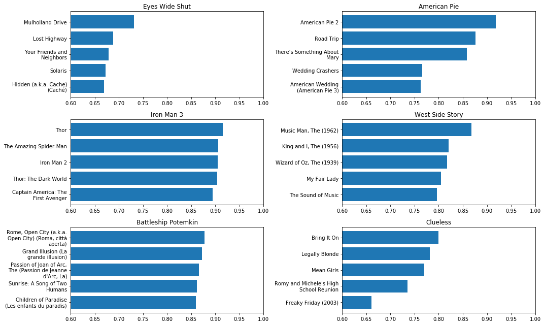 我们在上面已经看到了这方面的一个小例子:与哈利波特电影最接近的邻居是饥饿游戏系列的电影 - 另一组基于一系列青年幻想小说的电影。这说得通!