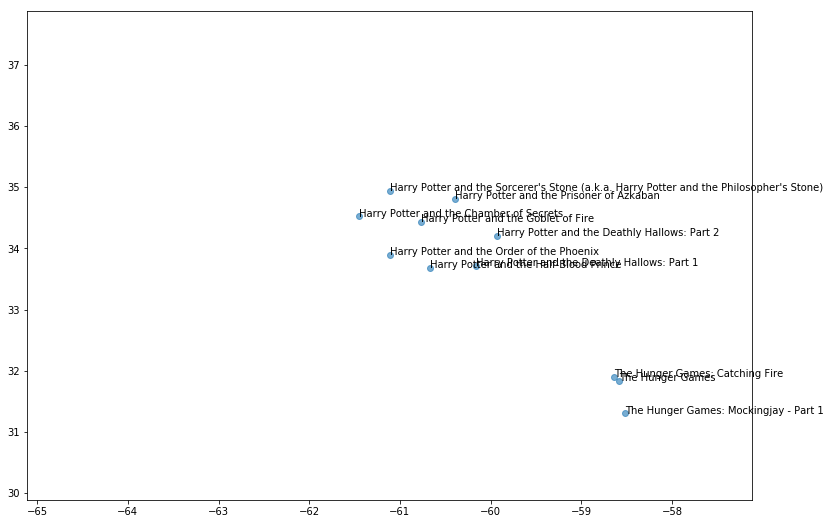 这种降维的全部意义在于可视化,所以让我们使用 matplotlib 绘制我们电影的散点图,使用我们新的二维映射。